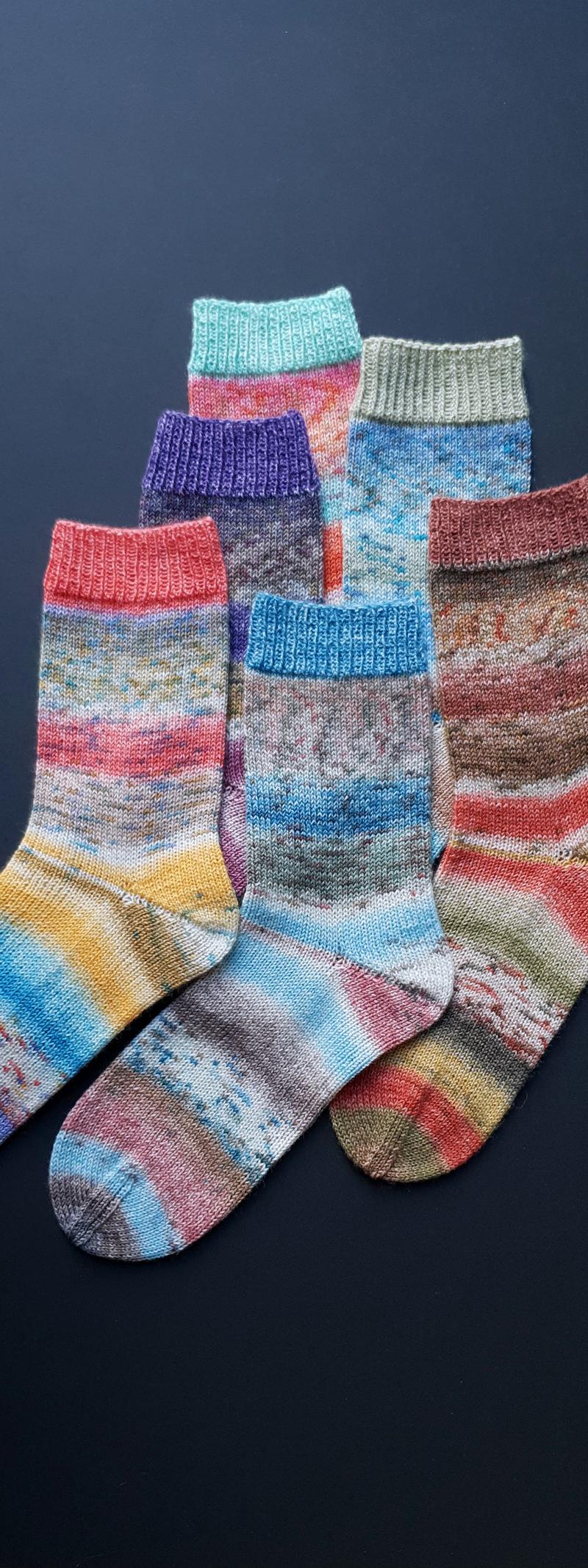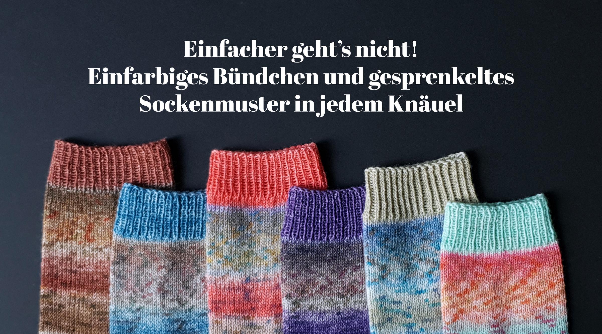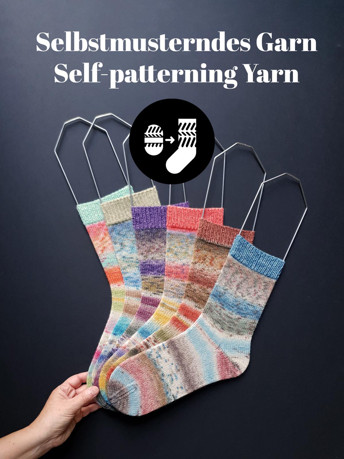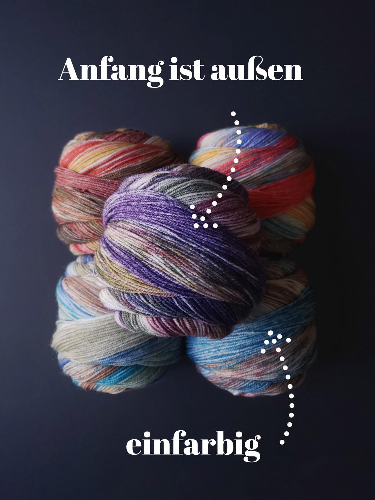 Die gesprenkelten Farbverläufe der „Carnival Socks“ wirken wie mit Aquarellfarben lasiert und bespritzt. Bei den 6 Farbvarianten sind fröhlich helle und auch etwas gedecktere Kombis dabei. Besonders hübsch finde ich die einfarbigen Bündchen, die jeweils eine markante Farbe aus der Socke aufgreifen. Beginne dafür das Knäuel von AUSSEN und die Socke Top-down.