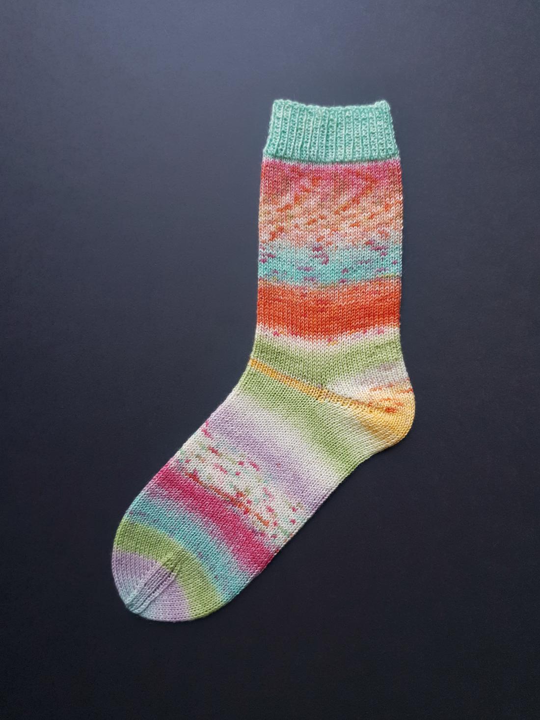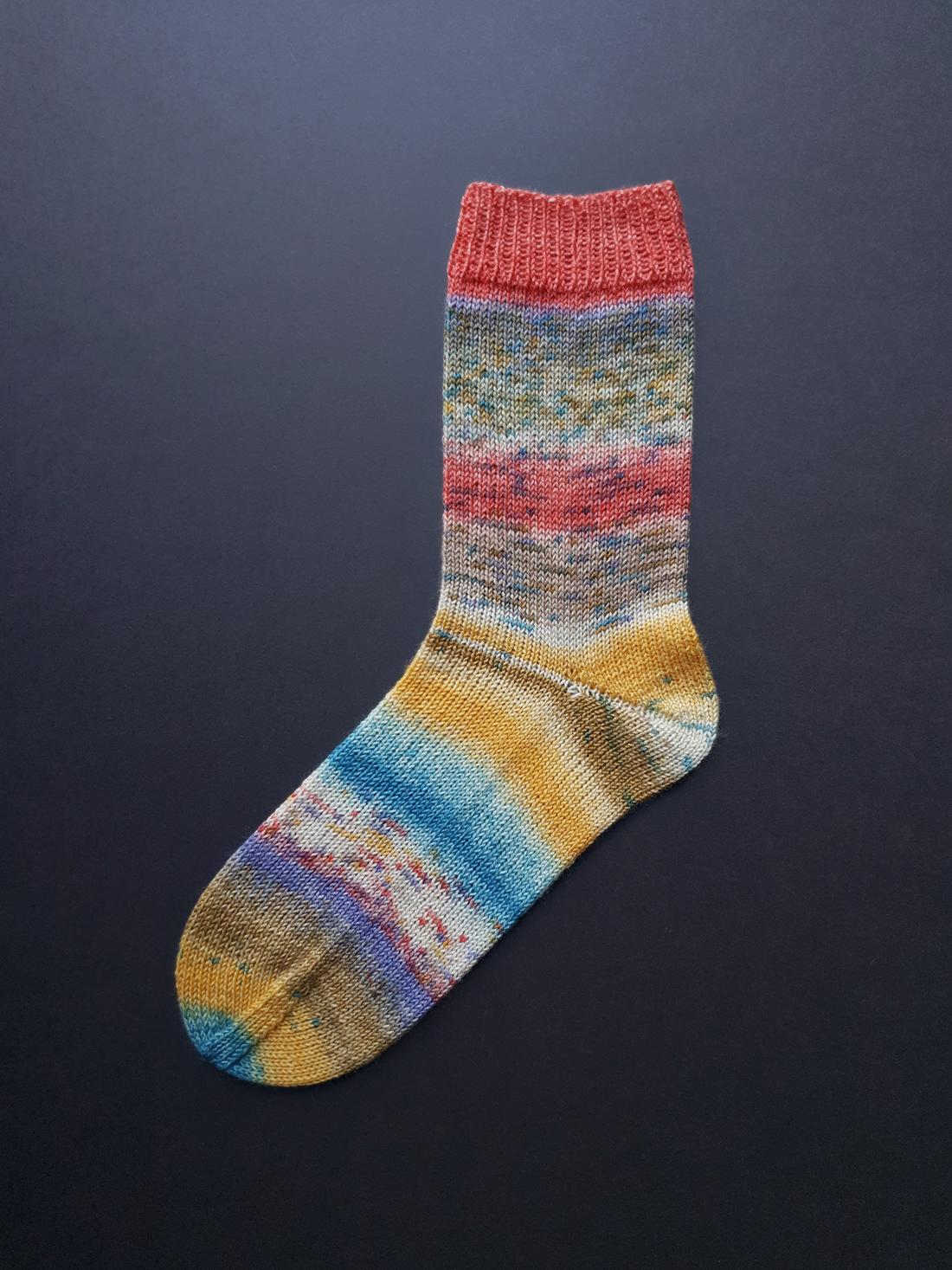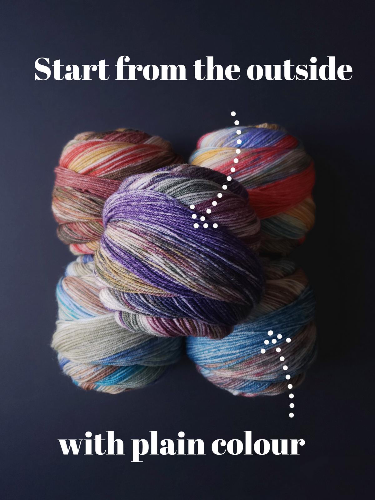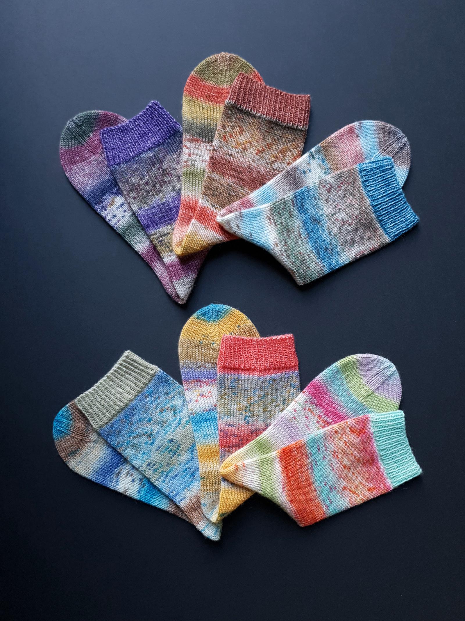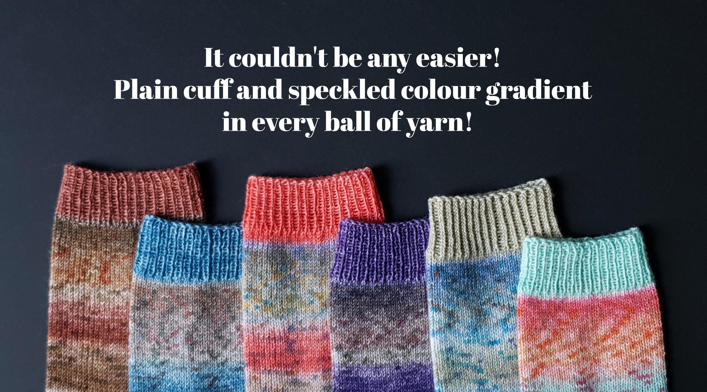 Die gesprenkelten Farbverläufe der „Carnival Socks“ wirken wie mit Aquarellfarben lasiert und bespritzt. Bei den 6 Farbvarianten sind fröhlich helle und auch etwas gedecktere Kombis dabei. Besonders hübsch finde ich die einfarbigen Bündchen, die jeweils eine markante Farbe aus der Socke aufgreifen. Beginne dafür das Knäuel von AUSSEN und die Socke Top-down.