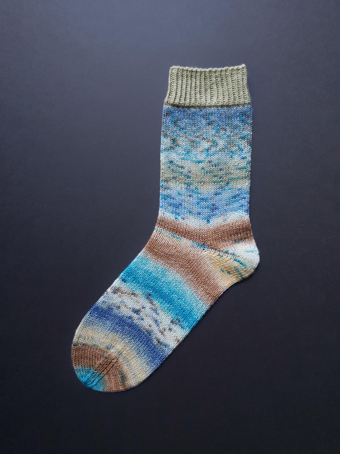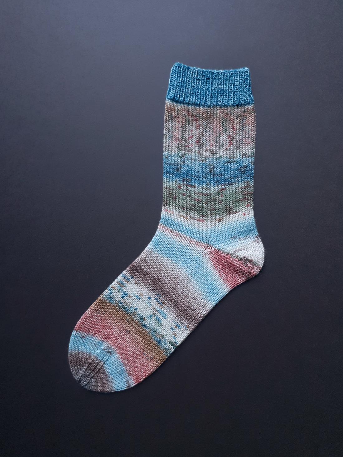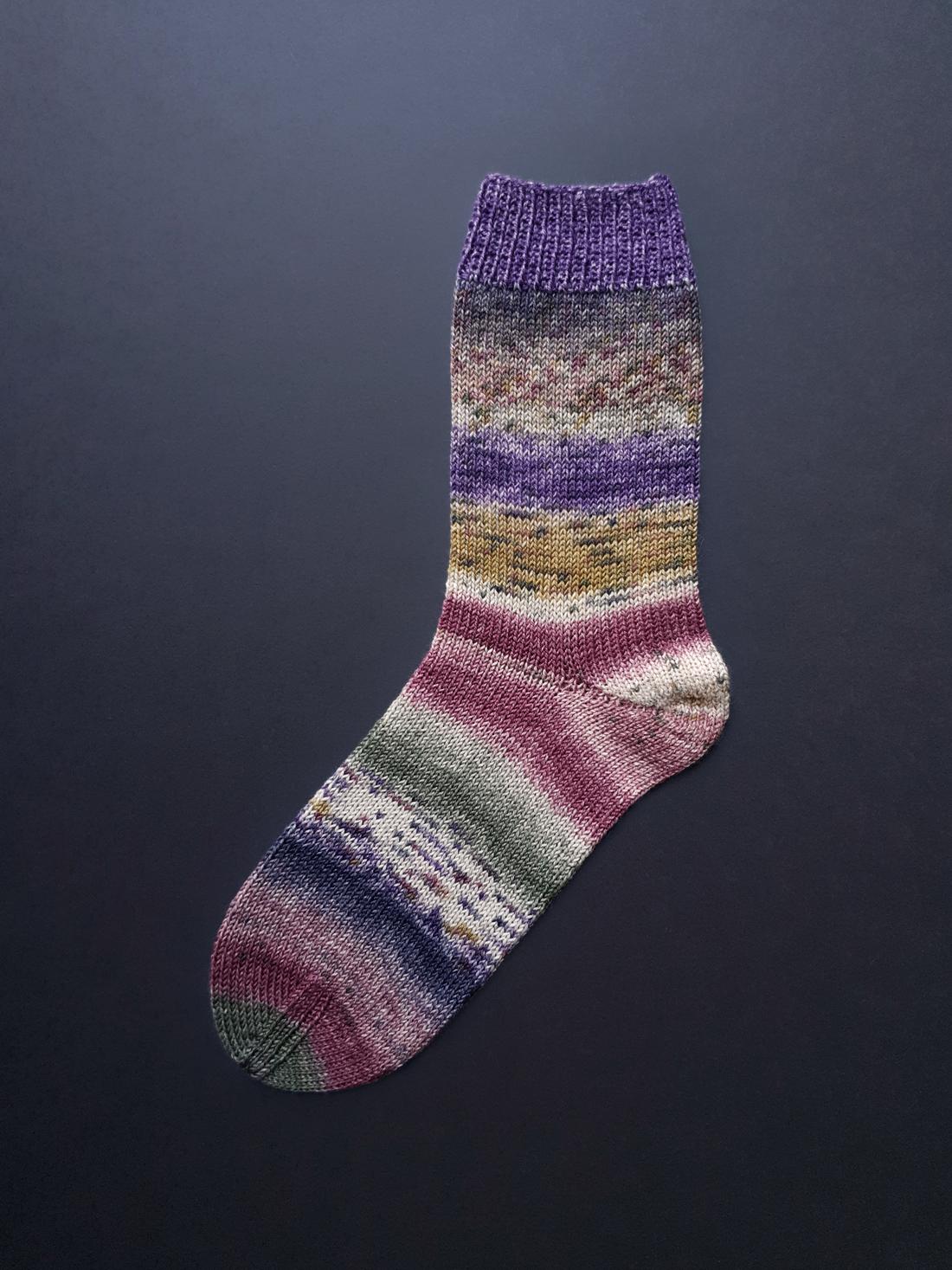 Das Garn mit klassischer 75-25-Mischung und idealer Lauflänge für Socken von 420 m auf 100 g ist angenehm weich wie Maritozzi (italienische Milchbrötchen), dem ich 6 von 7 Wölkchen auf meiner Weichheits-Skala gebe. Das ist bei selbstmusternden Garnen gar nicht selbstverständlich, denn mitunter sorgt der Färbeprozess eher für 5 Wölkchen. Nicht so bei „Laines du Nord“! Bravo! Bravissimo!